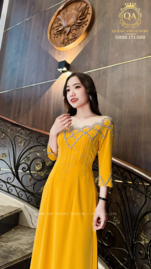 Áo Dài Truyền Thống Lụa Bảo Ngọc Đính Đá Pha Lê Màu Vàng 4 Tà Lita Dress